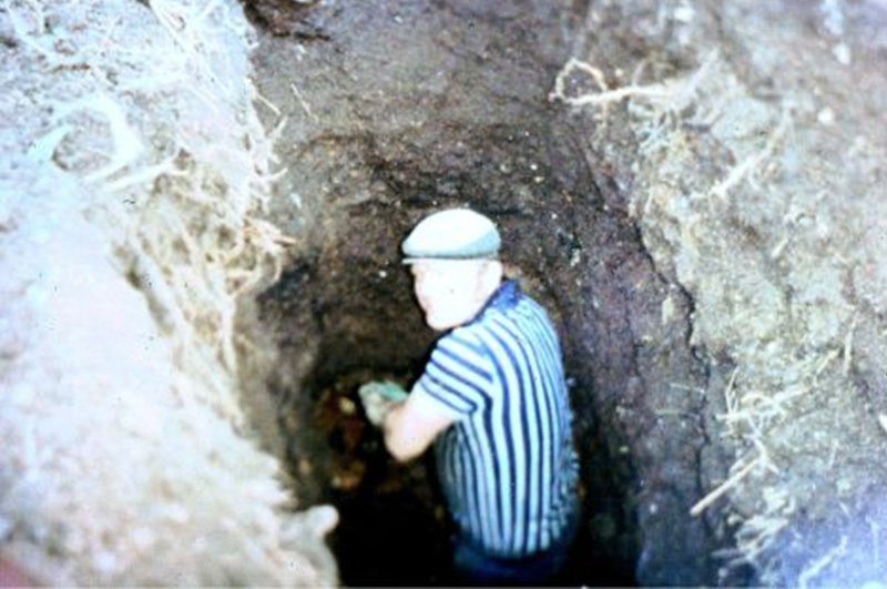 Entirely out of the blue, Bill from Farnham Maltings rang and asked If I would like to go on a dig before an area was dug and redeveloped. I had a very big motor at the time and that was one of the reasons for his call, his van was off the road for a short period and this opportunity arose. Very early on Sunday morning 04.30 in fact I picked up Bill and his mate and all the tools (They both had very thick heavy steel bars about 5 feet long!) and off we went heading to Southampton. The site was a mass of concrete 5 to 8 inches thick, the plan was to dig a out a circle about 2 foot 6 inches wide to allow access under the concrete (hence the iron bars), and then undercut in a circle all the way around. We teamed up to help each other to dig out the circular entrance ways. Luckily I had previously acquired a short handled ex army trenching tool which helped. The digging was compacted soil and then levels of ash and debris, Bill and his mate are both landscape gardeners and by heck could they dig, my life was spent behind a desk and I took my time to make sure I could make a day of it.