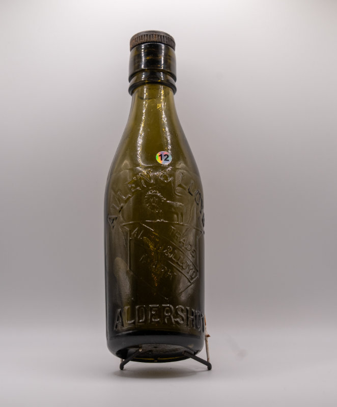 Embossed Front: Full circle on the front with ARMY & NAVY COOPERATIVE BREWERIES following the contour of the circle and ALDERSHOT horizontally across the centre..