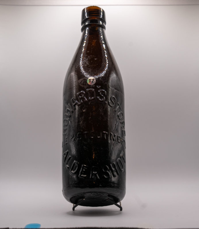 Embossed Front: HOWARDS STORES ALDERSHOT in a full circle on the front and ALE & STOUT MEHTS across the centre.
